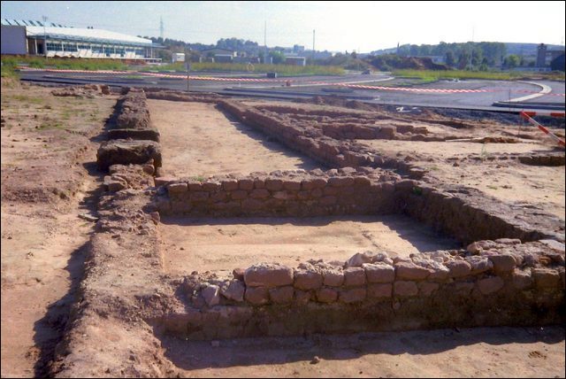 Ausgrabungsgelände wieder zugeschüttet. Heute befinden sich die Hallen